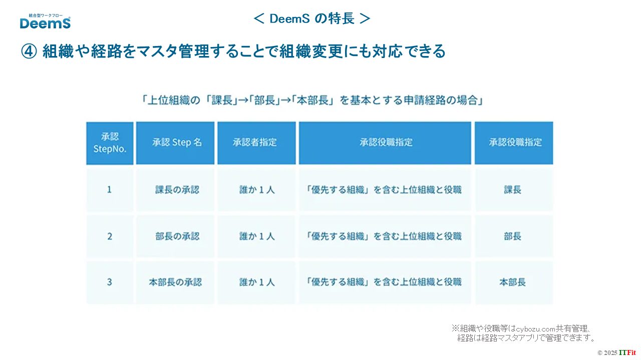 kintone標準プロセス管理では組織変更が頻繫にある場合、各アプリにおいてプロセス管理の設定を変更する必要があり、メンテナンスの手間が煩雑だという声がありました。DeemSワークフローでは、組織定義はcybozu.com共通管理にて管理し、ワークフローの経路はDeemS経路定義アプリで一元管理することで、組織変更の際には新規申請から一括で反映されます。(「優先する組織」と「役職」を利用します。)