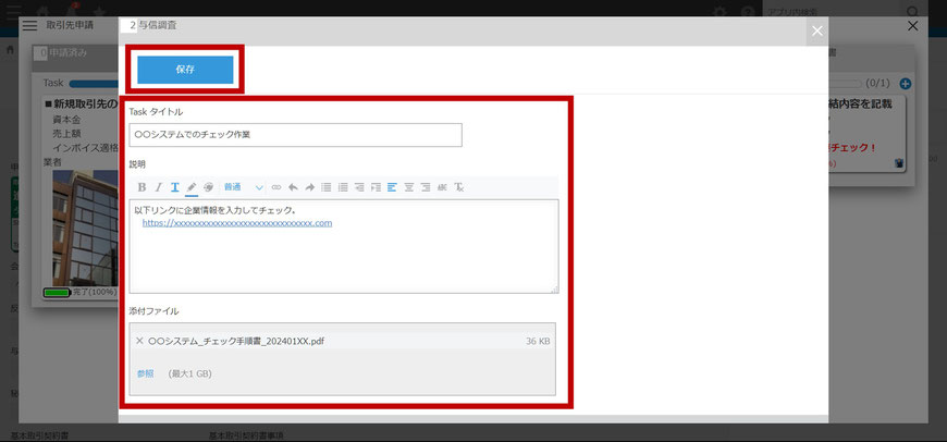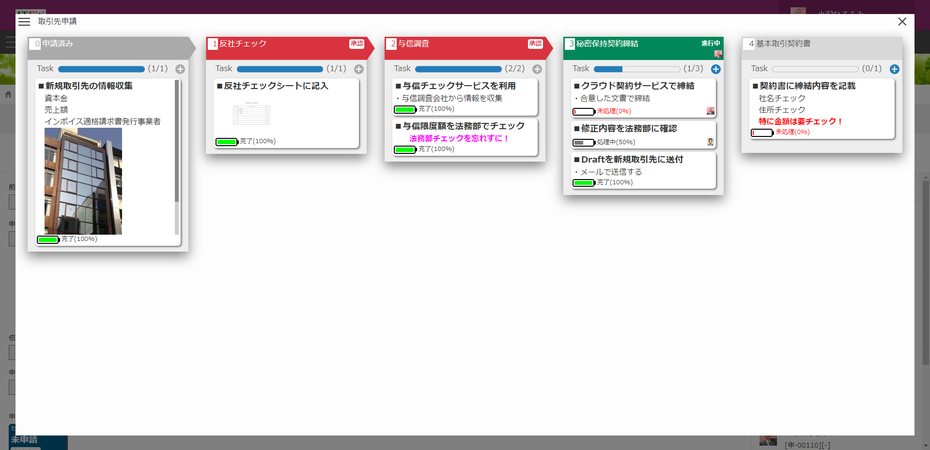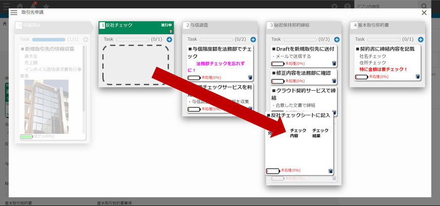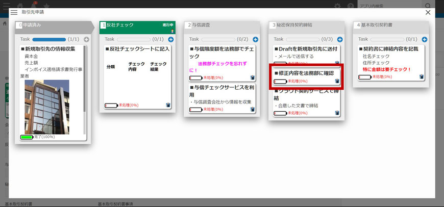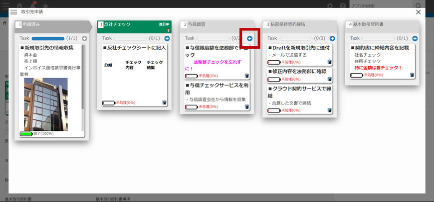 「カンバン表示」画面にてタスクを追加、編集したり、紐づけた承認Stepを変更できます。