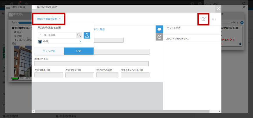 ※ タスク担当者の変更は「現在の作業者を変更」から可能