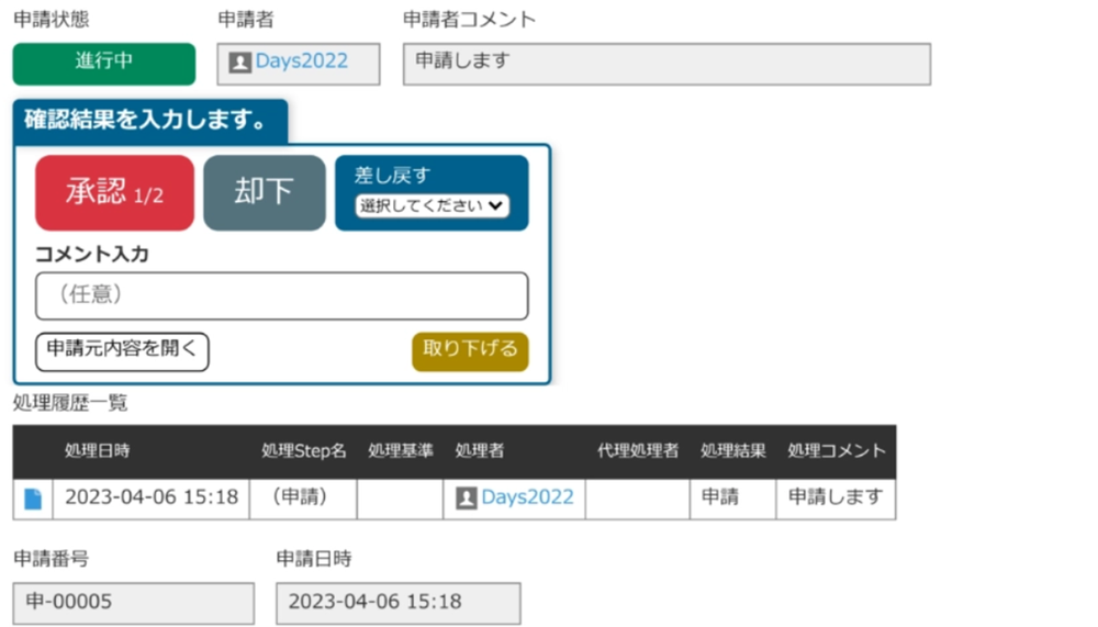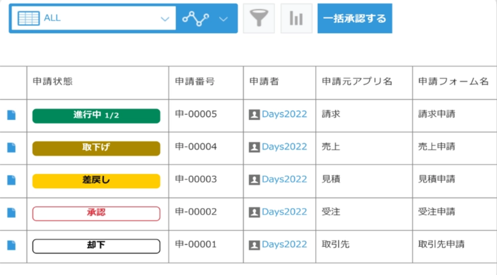 ワークフローの操作(申請や承認、一覧)は全てkintoneアプリ上で実施します。