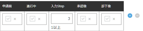 1.承認処理をする際に申請元フィールドの入力を必須化したい場合は、対象の申請元フィールドの「入力Step」に「DmS経路定義」レコードの「承認StepNo.」を入力。