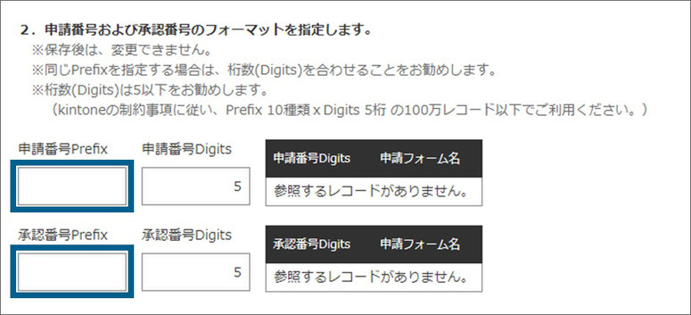 [Prefix](プレフィックス)を空白にする事により、申請番号、承認番号の自動採番を数字のみにできます。