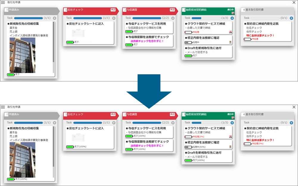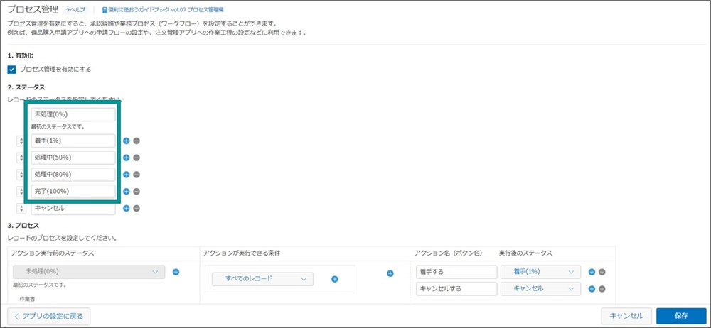 「DmSタスク」アプリのプロセス管理ステータス名に数値を含めるだけで、カンバン方式の一覧上に%(パーセント)を表示することができます。