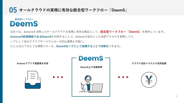 当社では、kintoneを活用したオールクラウドの実現に有効な製品として、統合型ワークフロー「DeemS」を提供しています。