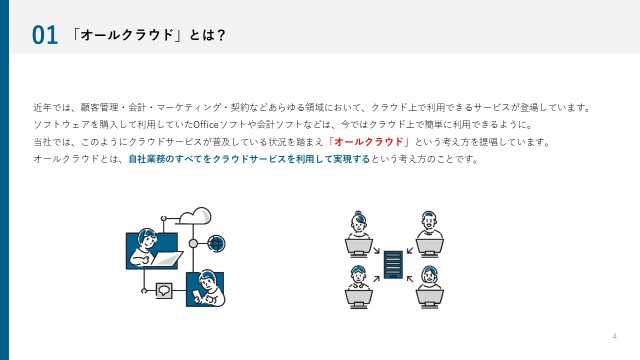 企業におけるクラウドサービスの利用が一般化する中、当社では自社業務のすべてをクラウドサービスを利用して実現する「オールクラウド」という考え方を提唱しています。