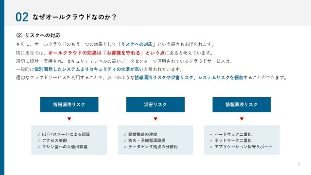 さらに、オールクラウドのもう一つの効果として「リスクへの対応」という観点もあげられます。