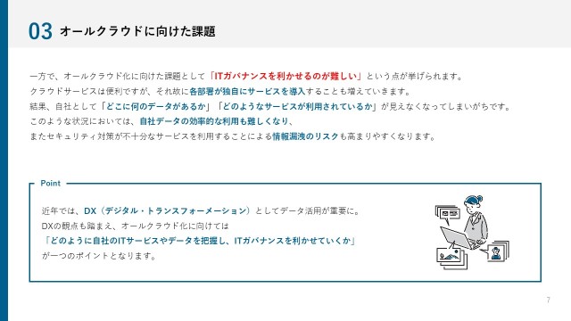 一方で、オールクラウド化に向けた課題として「ITガバナンスを利かせるのが難しい」という点が挙げられます。