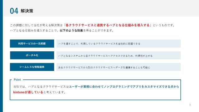 当社では、ハブとなるクラウドサービスはユーザーが業務に合わせてノンプログラミングでアプリをカスタマイズできる点からkintoneが適していると考えています。